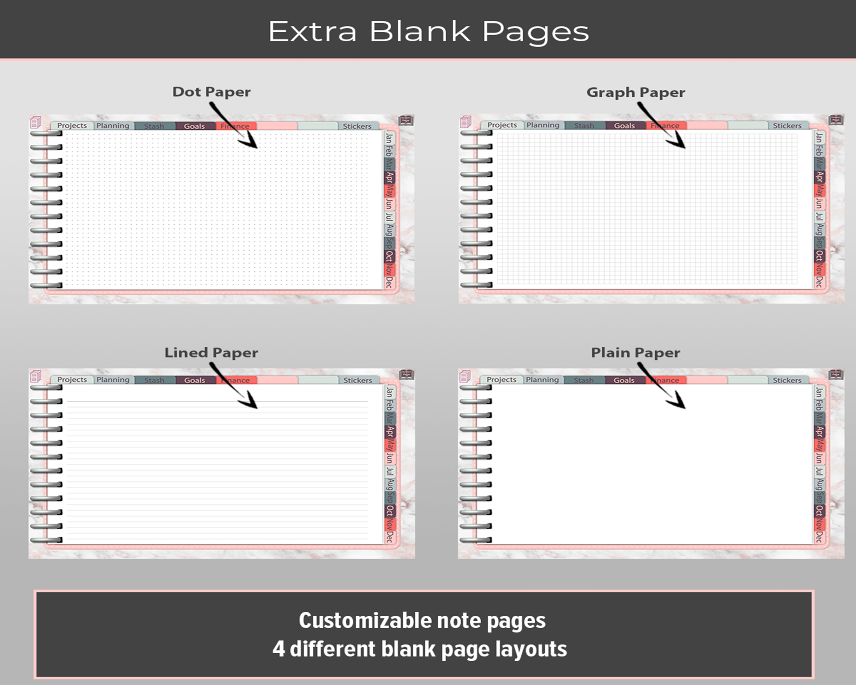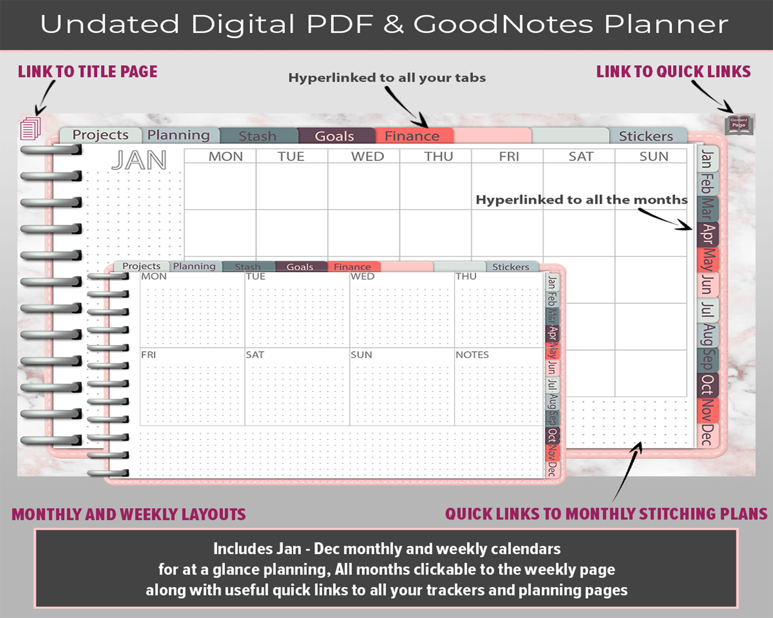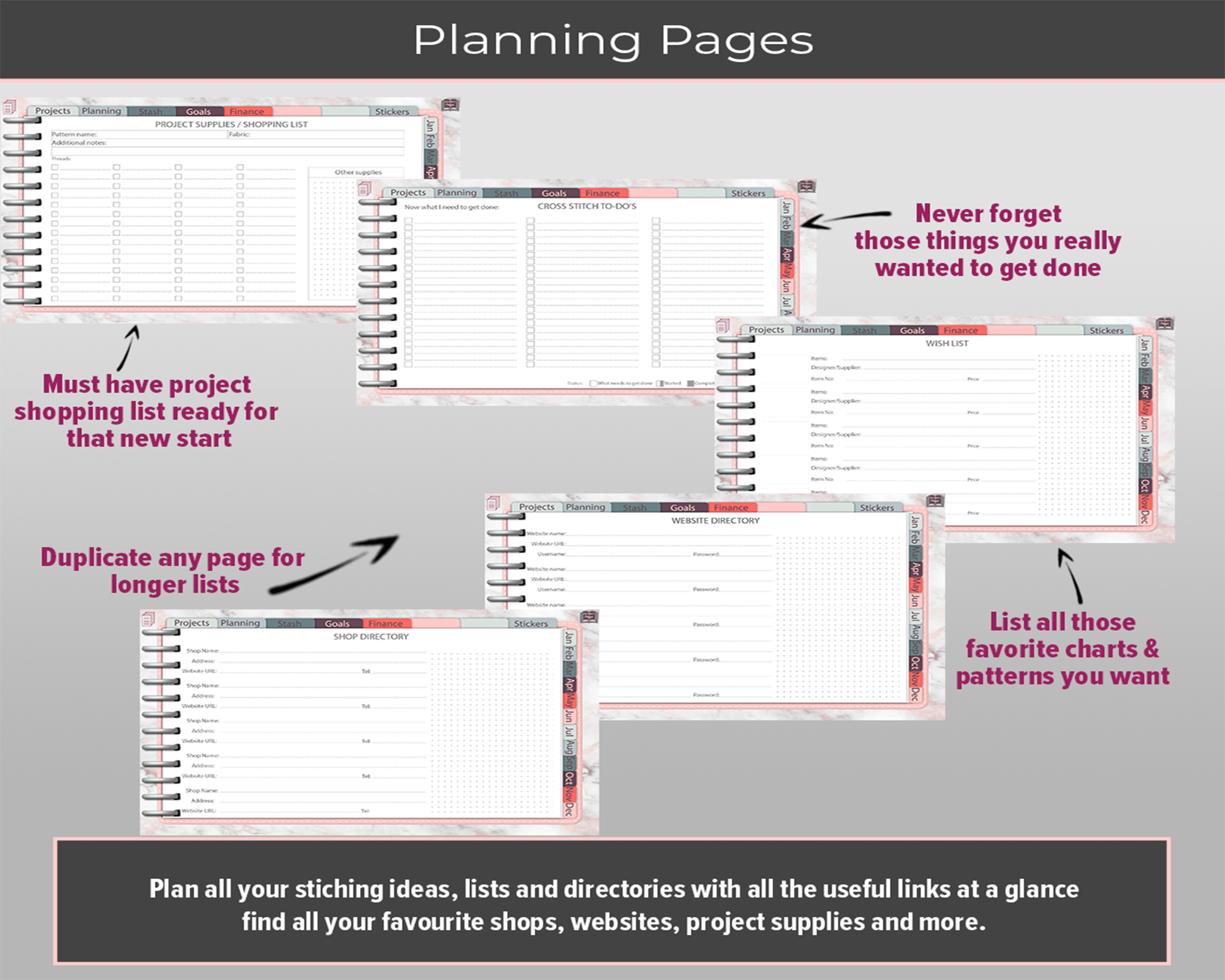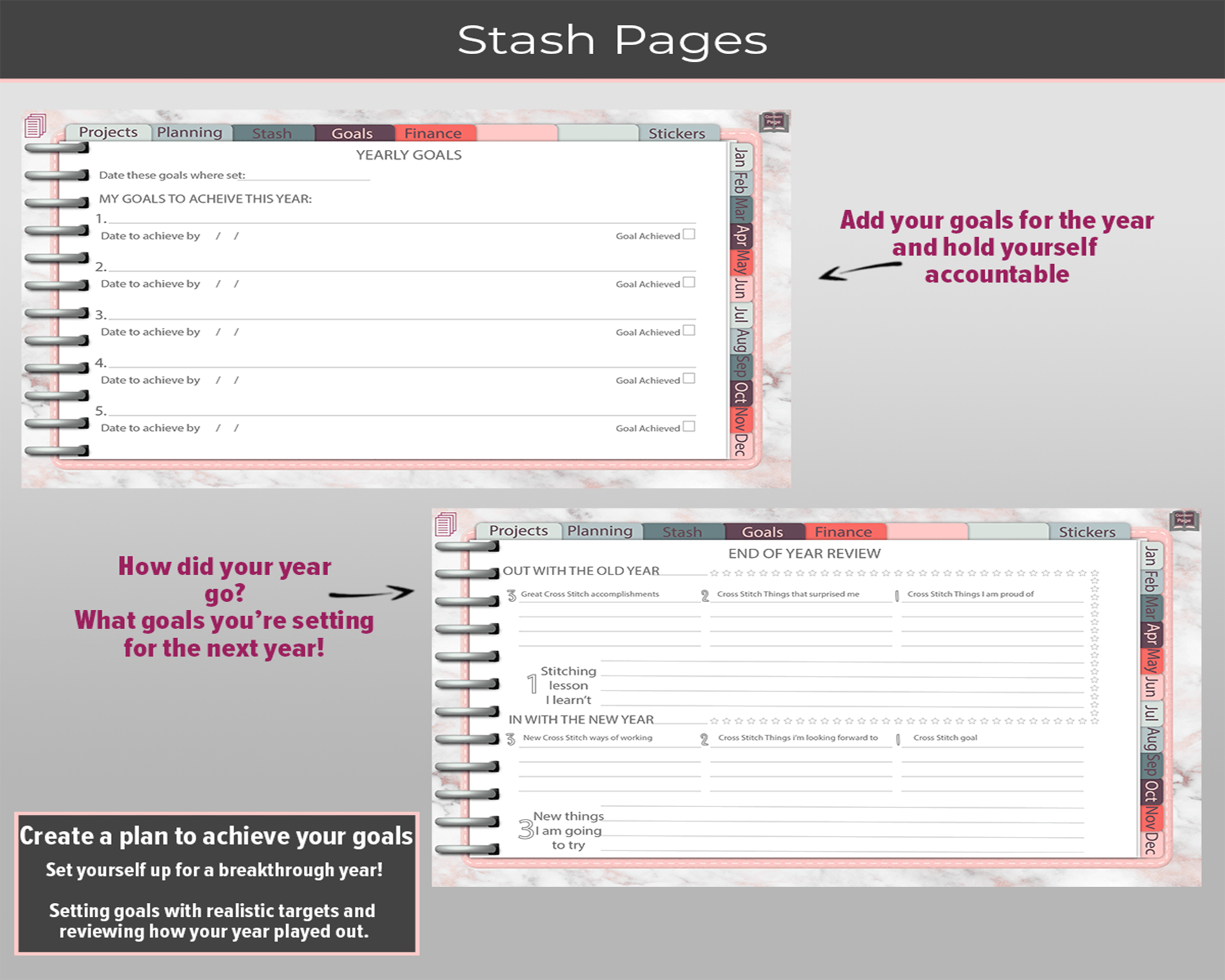 Digital Stitching Planner to use all year round, year after year. Includes Stitching trackers and planner layouts. Additional blank, Dot Grid, Graphed and Lined Pages, Premade Layouts; and more.