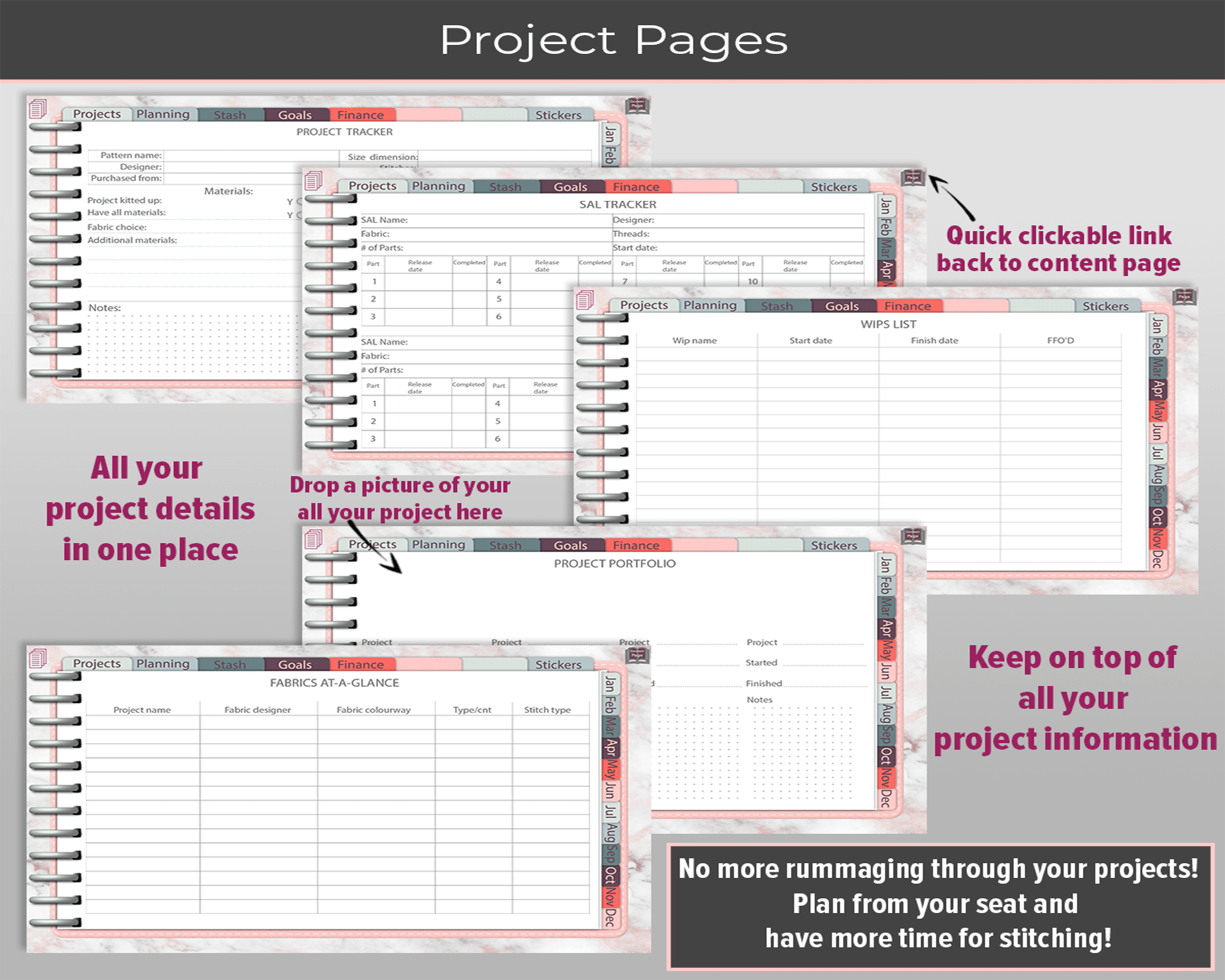 This planner comes with pre-made layouts to take care of all your stitching project planning and organizing of stitching and life, including additional tabs for you to add your own additional planning needs in your planner and more…