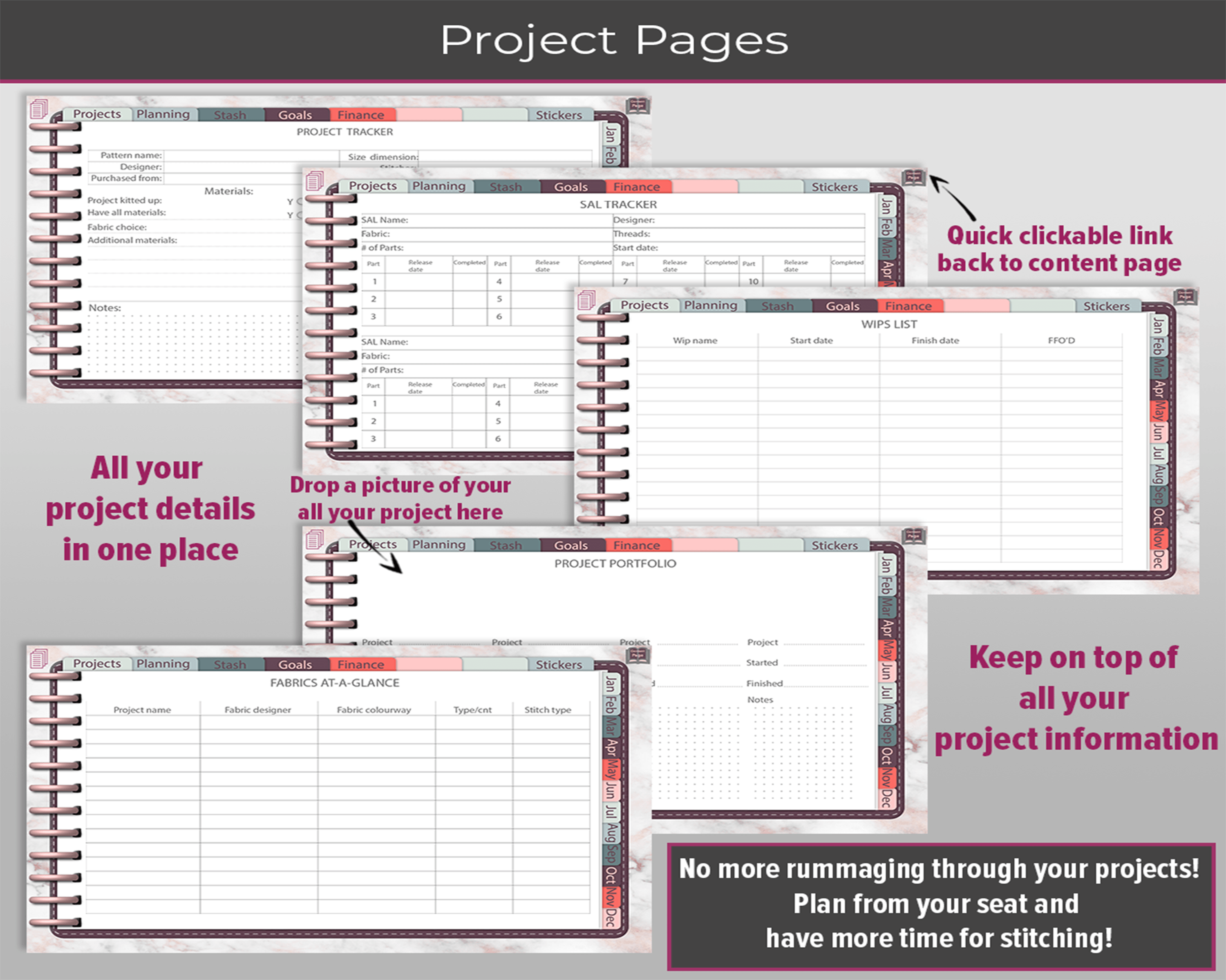 This planner has a professional but bright design that gives you the freedom to plan your stitching life exactly as you like. It includes monthly and weekly overview pages all hyperlinked.