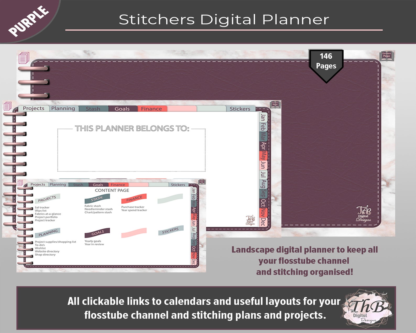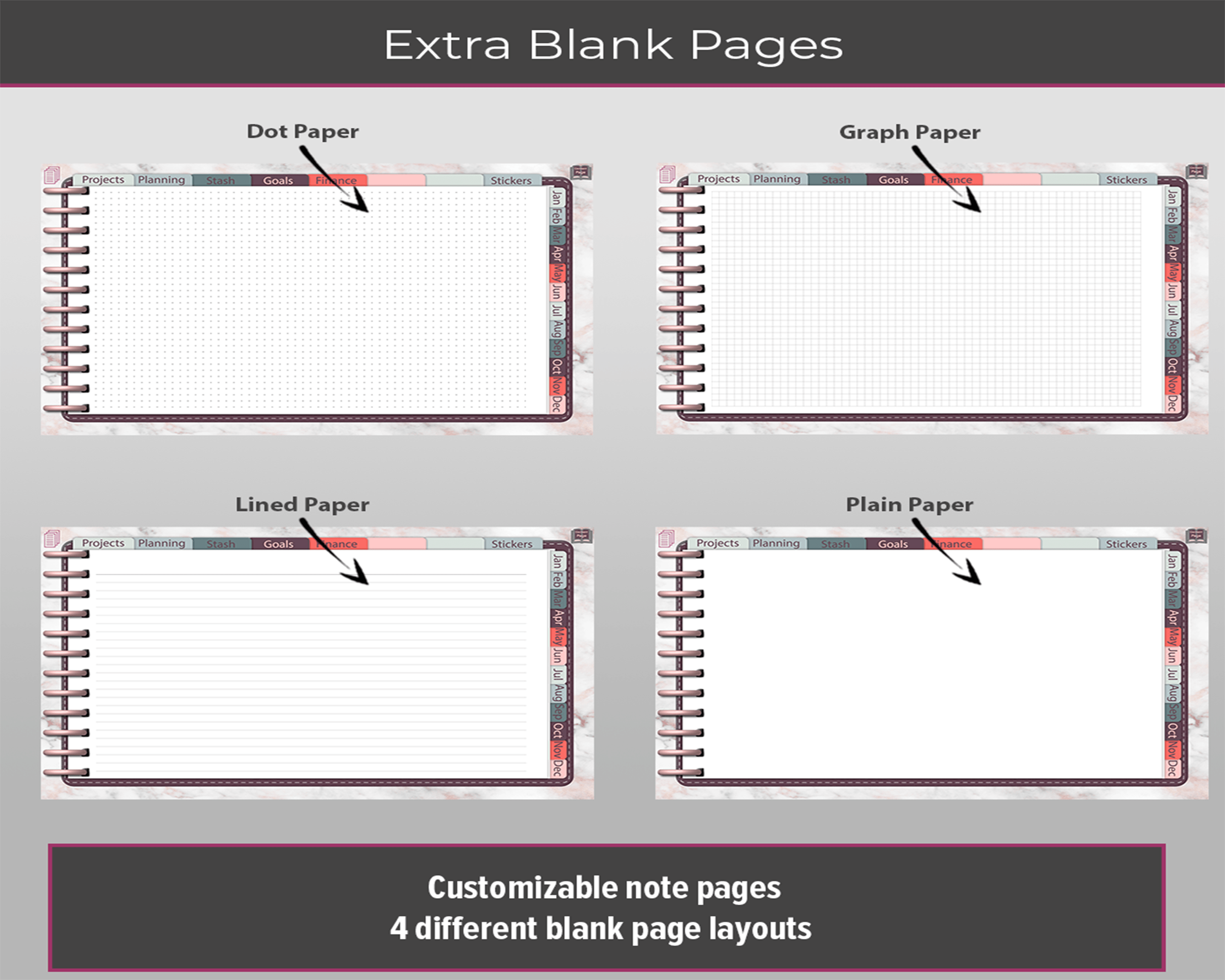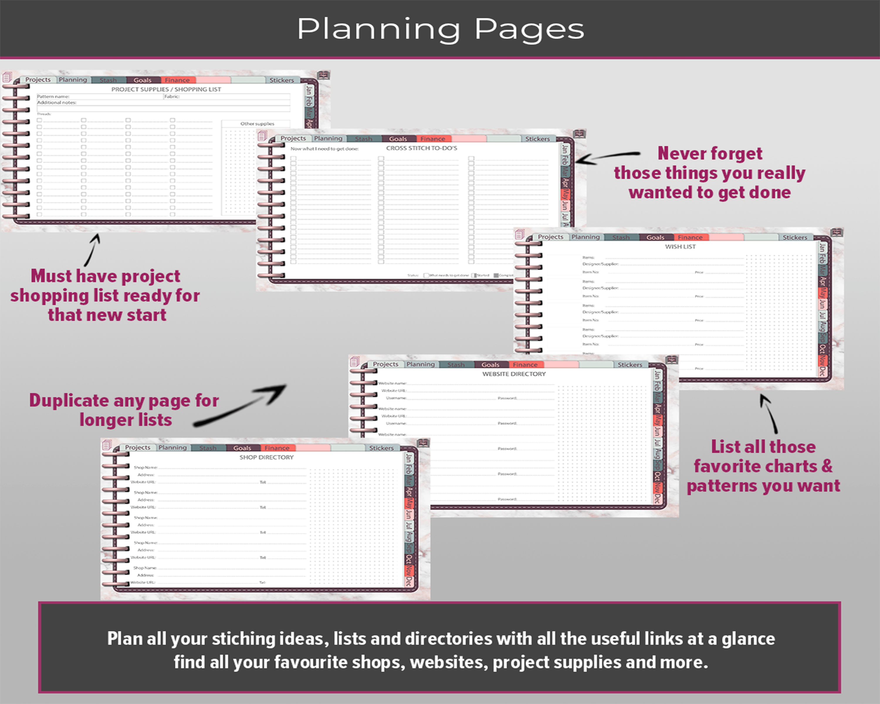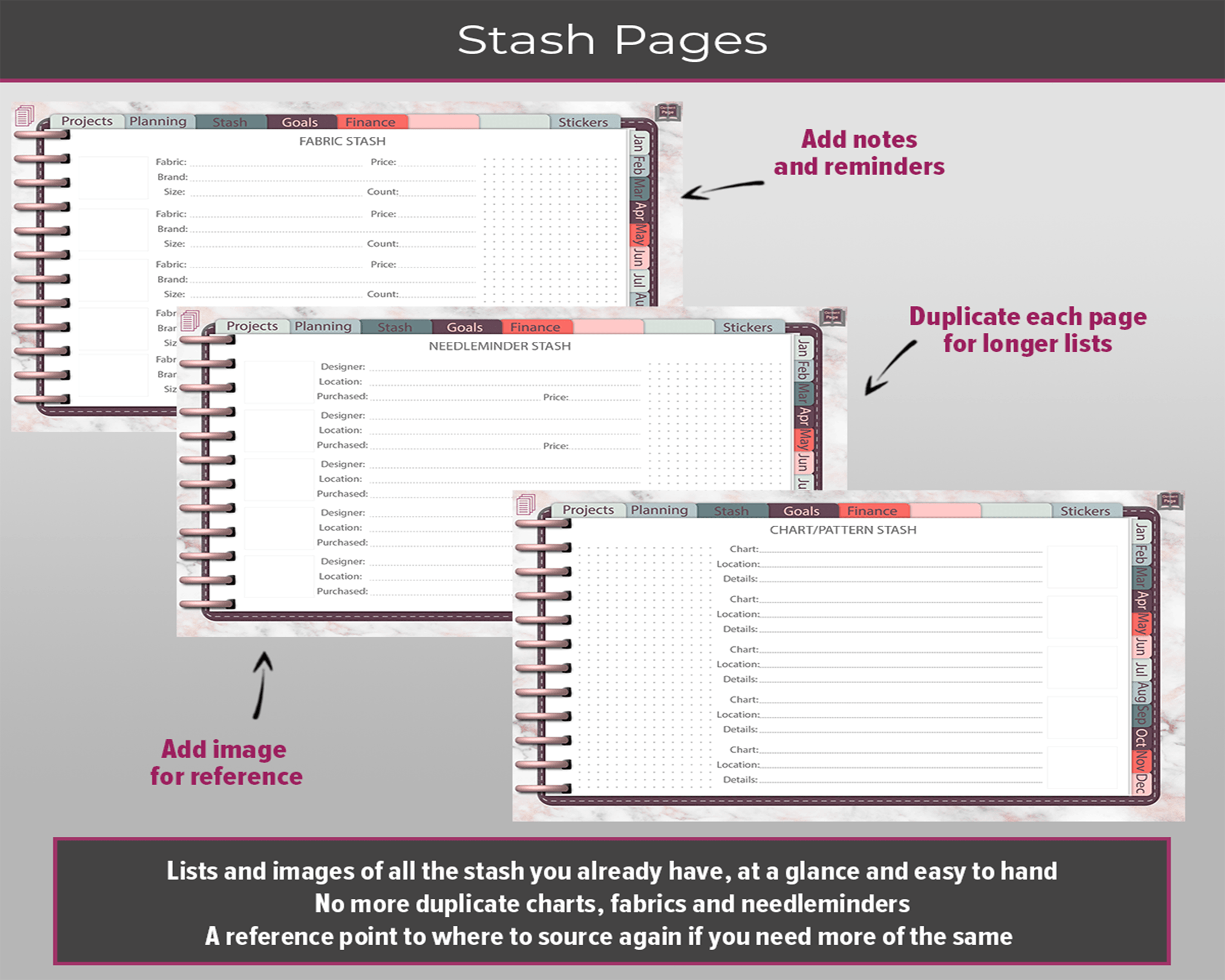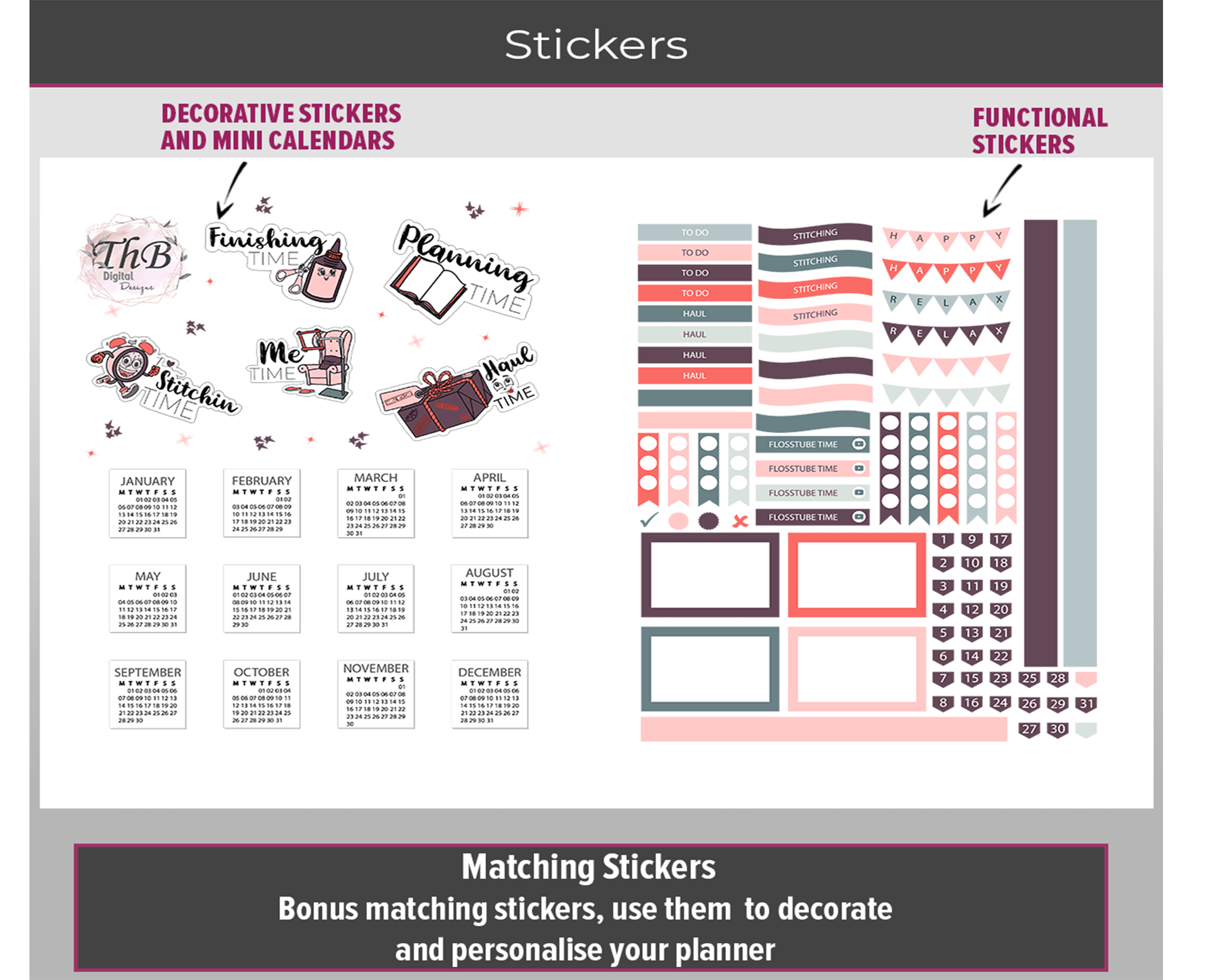Digital Stitching Planner to use all year round, year after year. Includes Stitching trackers and planner layouts. Additional blank, Dot Grid, Graphed and Lined Pages, Premade Layouts; and more.