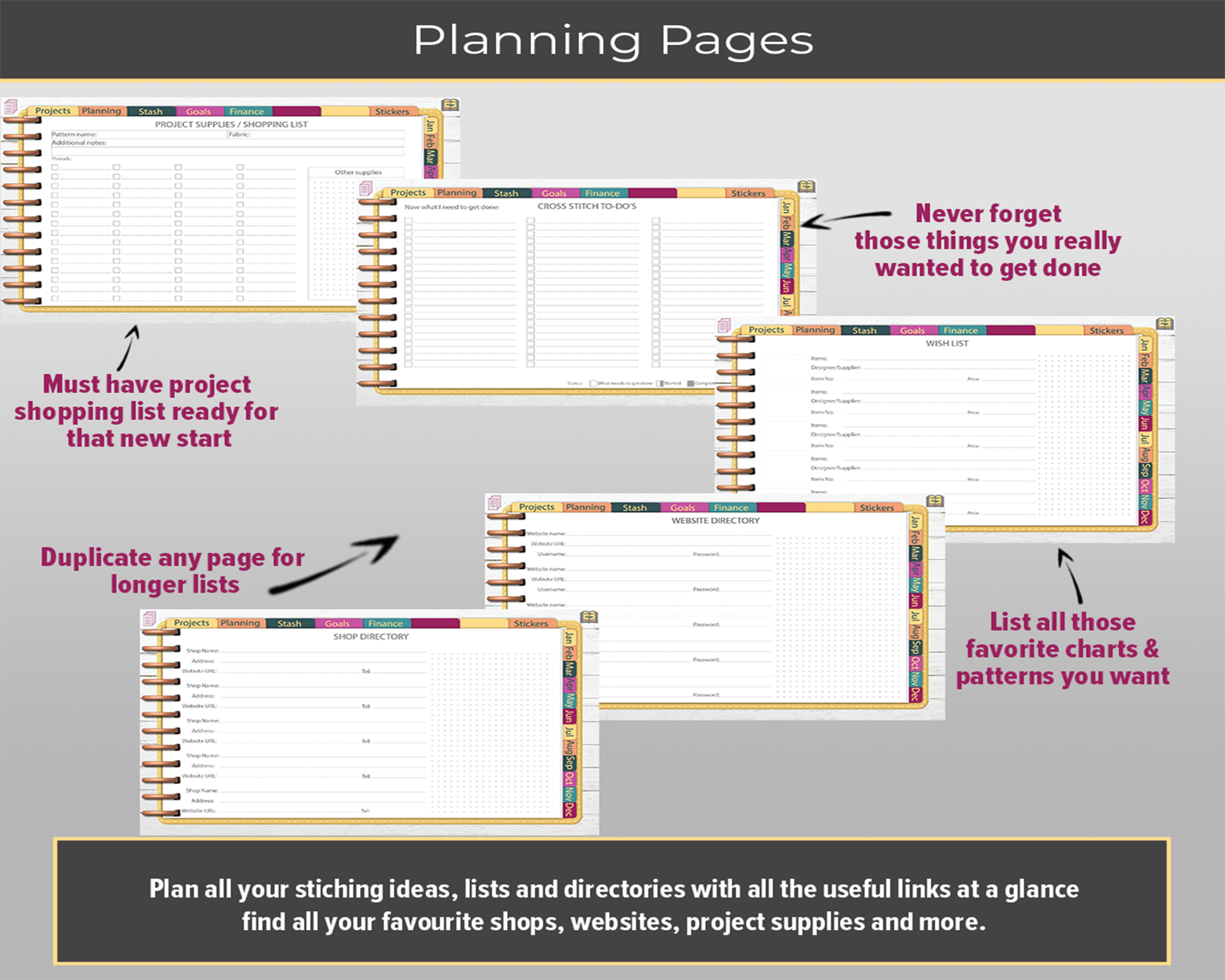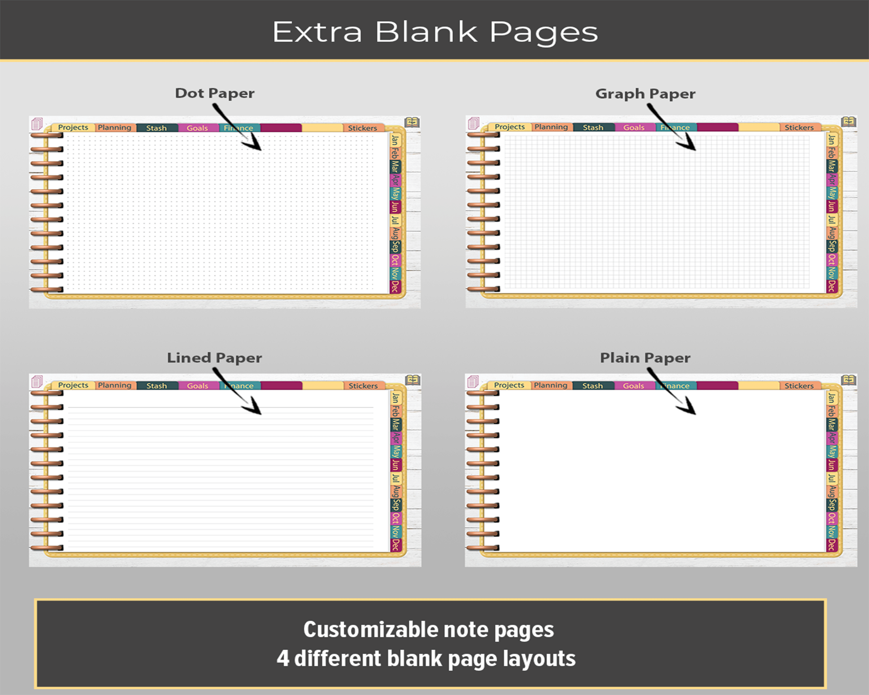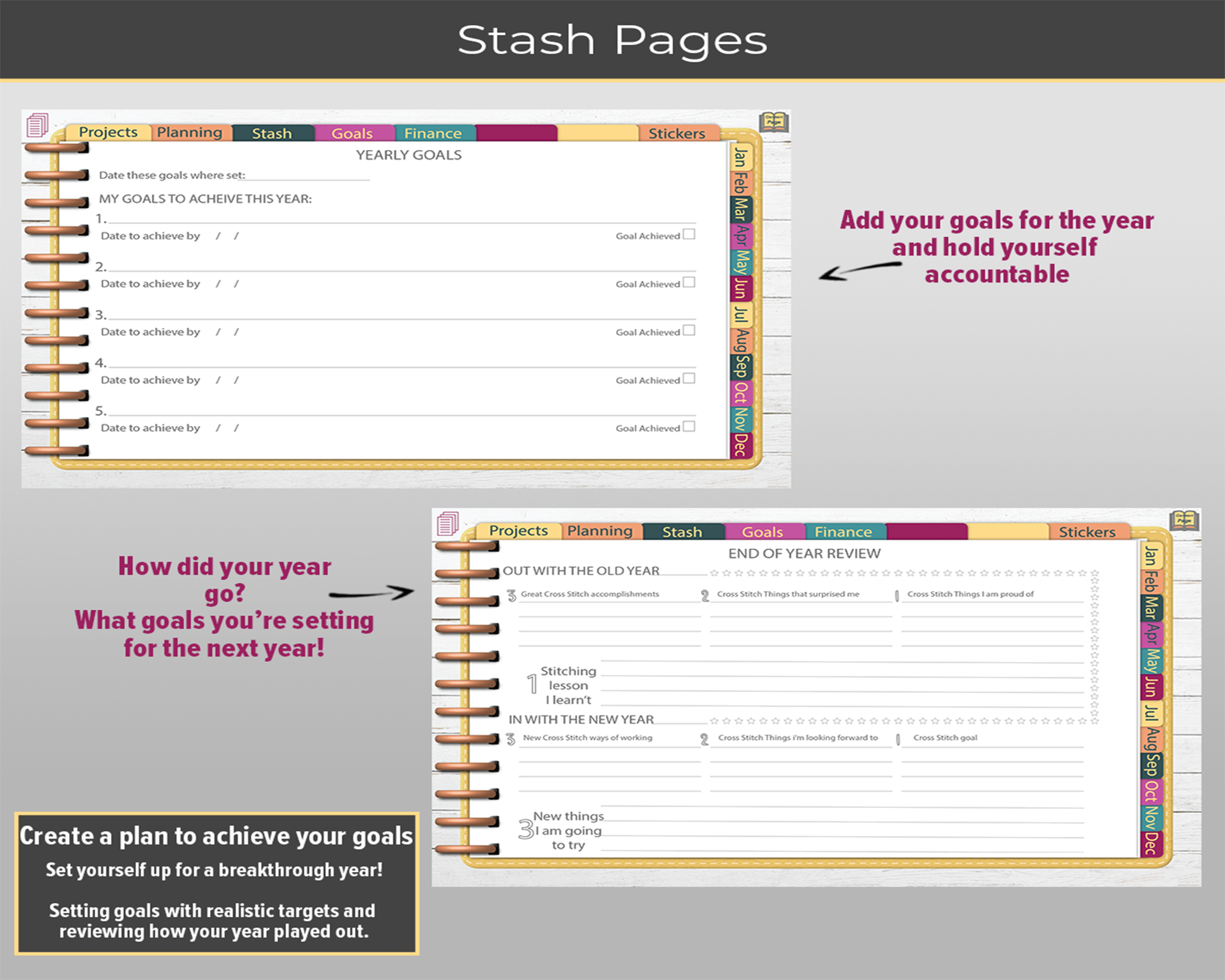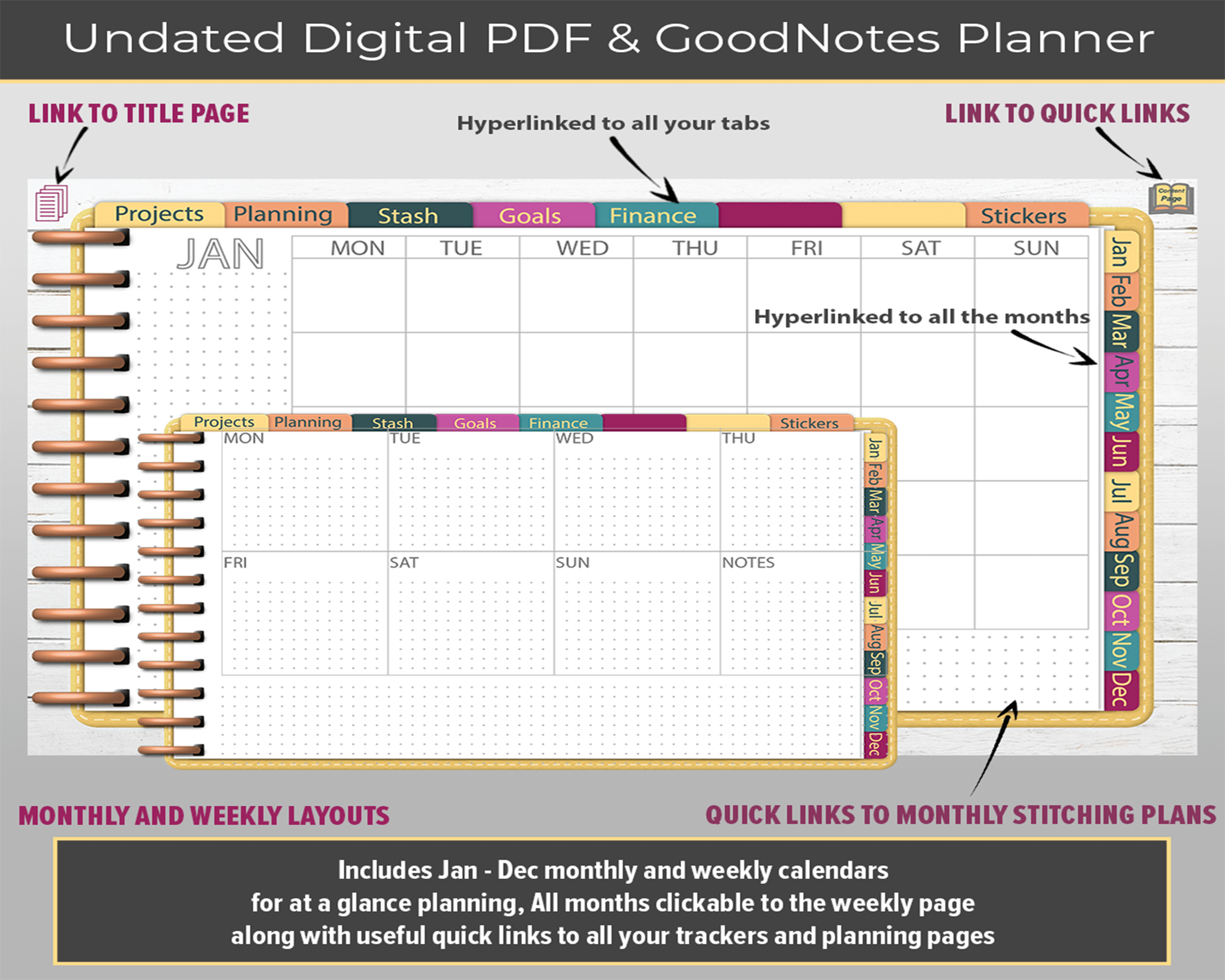 Digital Stitching Planner to use all year round, year after year. Includes Stitching trackers and planner layouts. Additional blank, Dot Grid, Graphed and Lined Pages, Premade Layouts; and more.