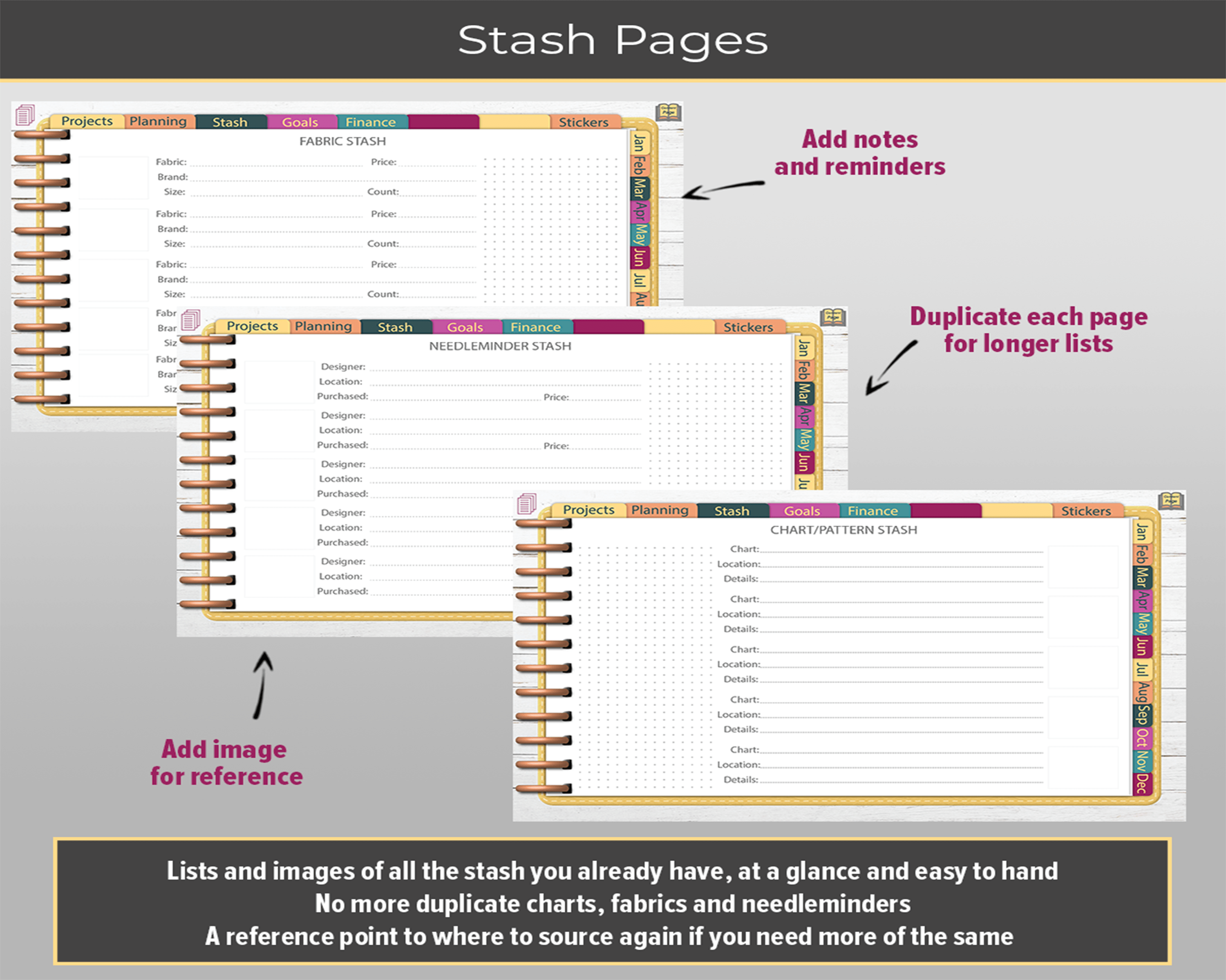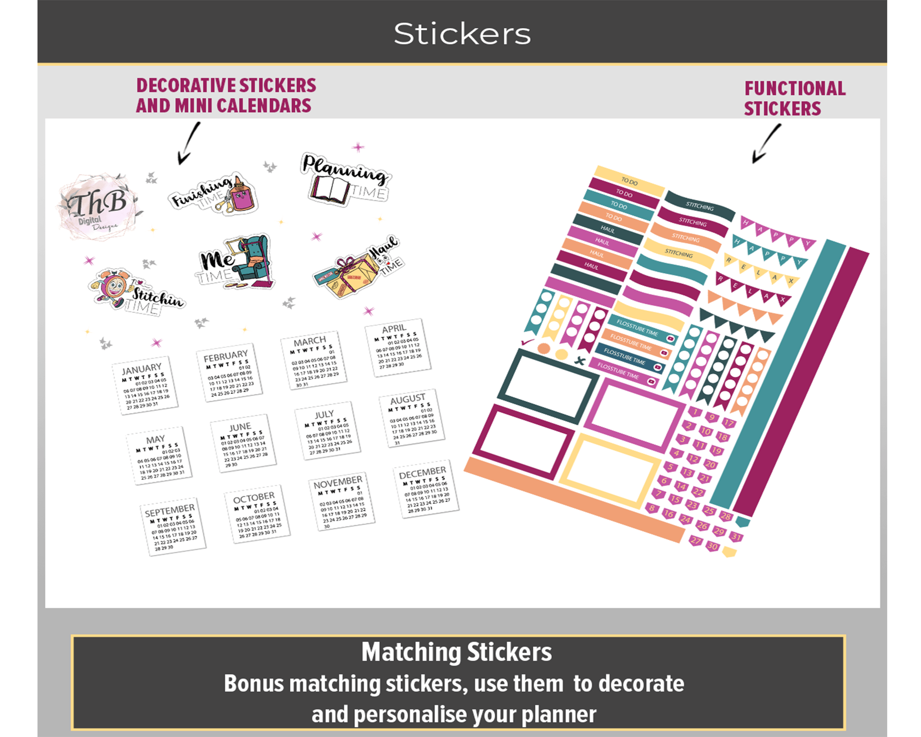 This planner comes with pre-made layouts to take care of all your stitching project planning and organizing of stitching and life, including additional tabs for you to add your own additional planning needs in your planner and more…